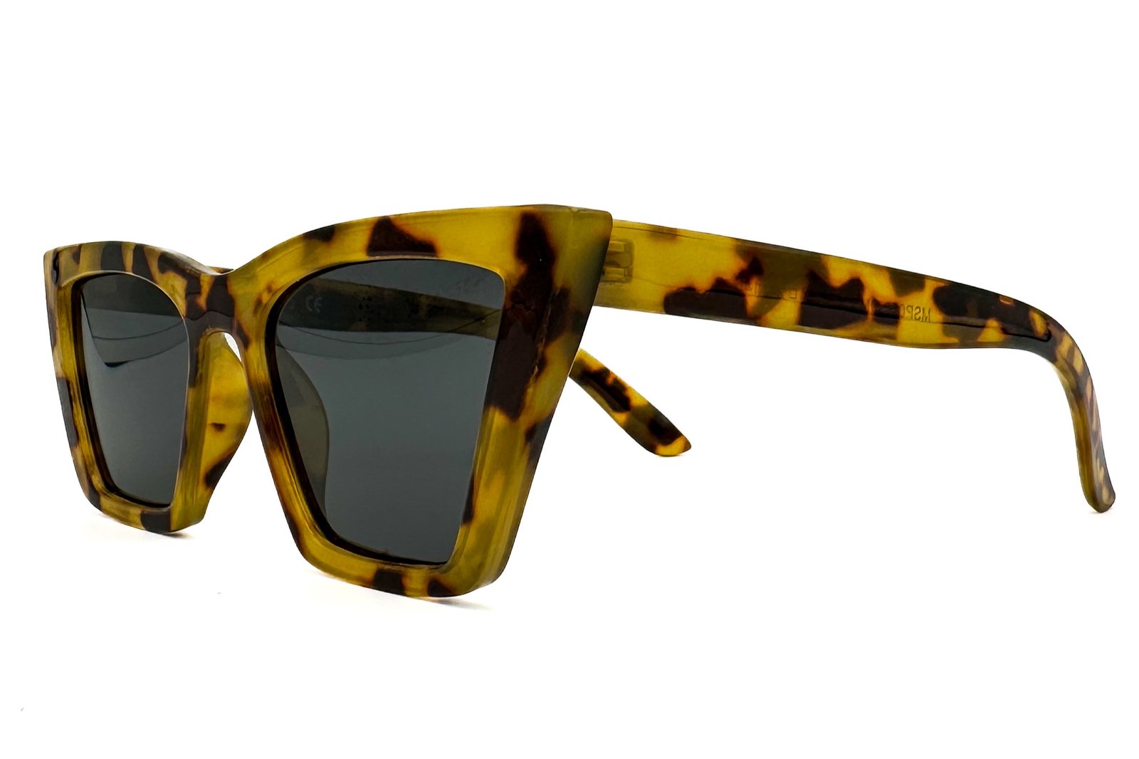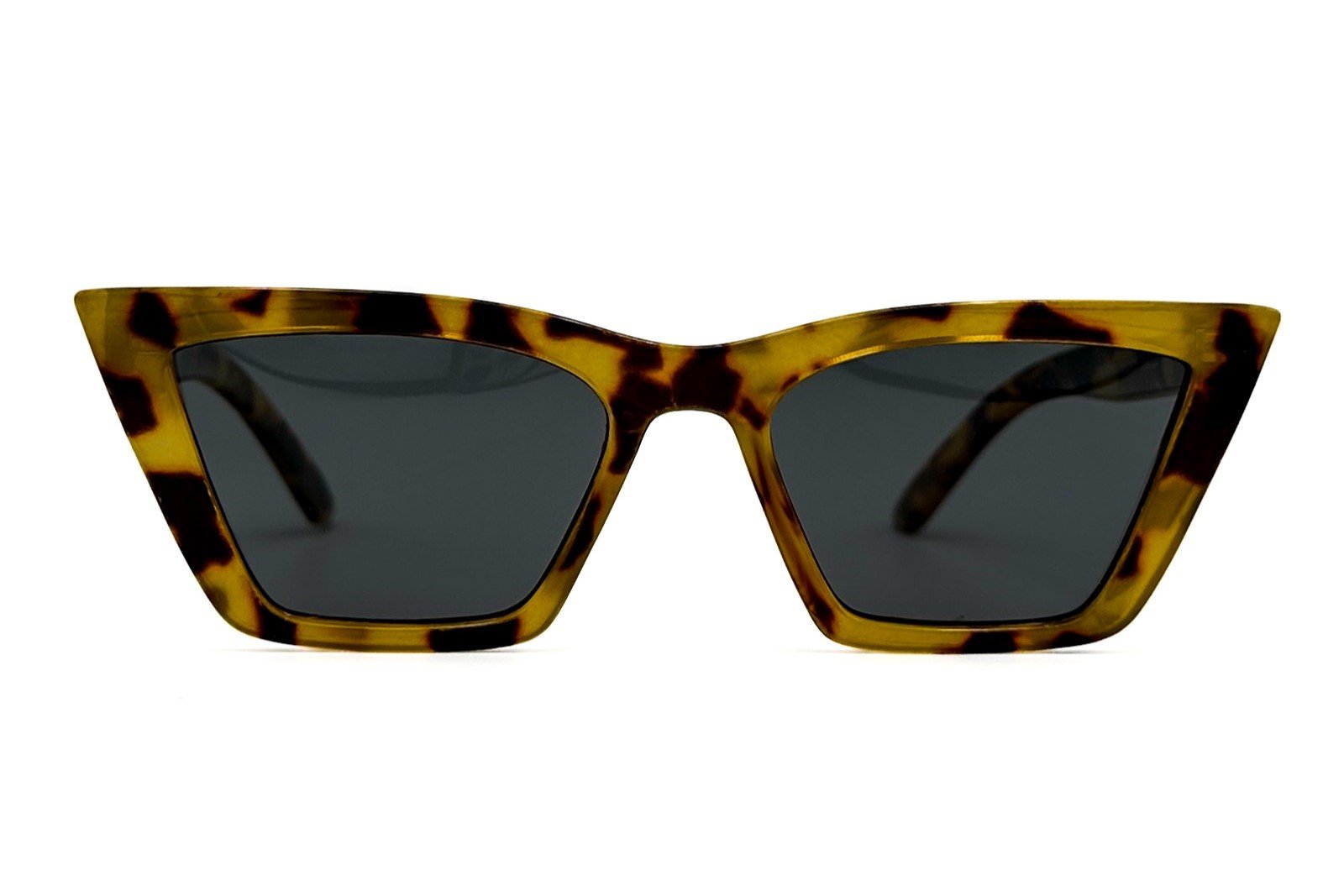 Glossy tortoiseshell angular cat-eye sunglasses with dark, protective lenses.